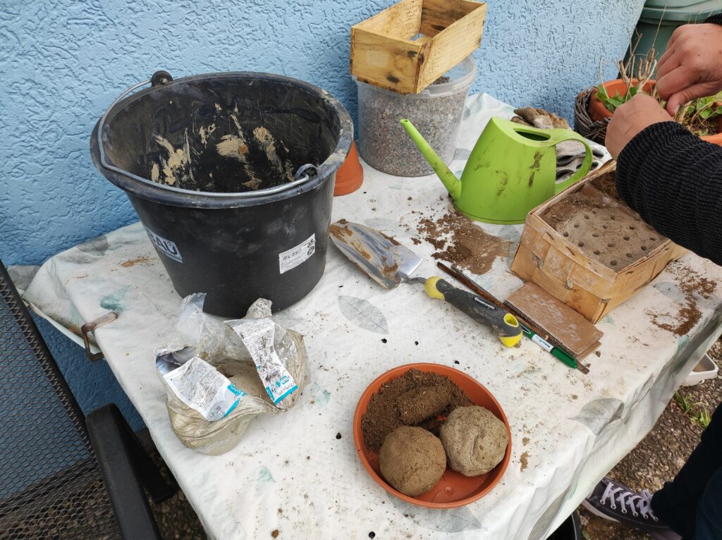 Die Kooperation von Britzer Wiesen und Guter Wille geht weiter. Letzte Woche hat Gabriele, vom Schaugarten Guter Wille, bei unserem Workshop für Nisthilfen und Vogelhäuschen mitgeholfen, und heute haben wir Lehmwände für Mauerbienen gebaut.