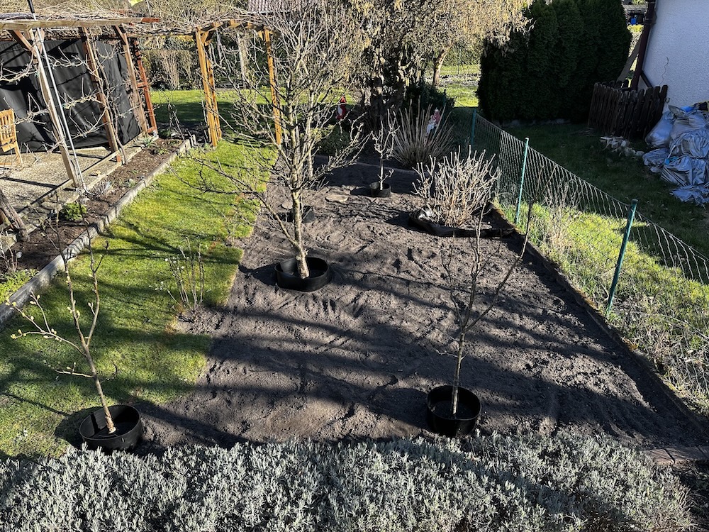 Zu sehen ist der Stand vom 4. April 2025. Die vorderen Kantensteine zur Rabatte sind verlegt und restlicher Sand vom Setzen der Kantensteine wurde zur Abmagerung verteilt. Die vorderen Baumringe (hier im Bild oben) sind eingesetzt und ausgerichtet. Hierbei stellte sich heraus, daß die Auswahl des Materials, Kunststoff 2 mm dick, nicht optimal ist. Der Kunststoff fängt sich an zu wellen und schiebt sich unterschiedlich nach oben. Es sieht, trotz Ausrichten mit der Wasserwaage, schief aus. Bis zur Aussaat der Wiese werden weitere Recherchen angestellt, ob ein anderes Material besser geeignet wäre.