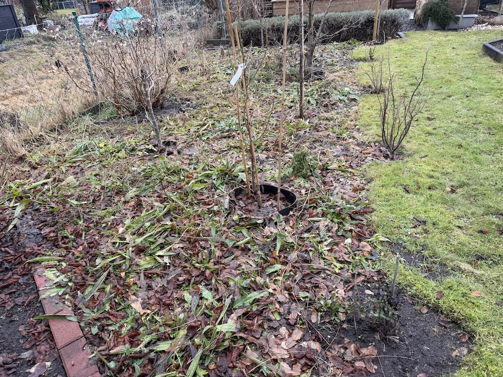 Leider musste der Pfirsichbaum entfernt werden. Die vielen Pfirsiche waren alle von einem Pilz befallen. Der Stamm und die Äste sahen aus als wären sie mit einem Klarlack überzogen worden. Großzügig die Erde entfernt und eine Säulen-Nektarine gepflanzt.